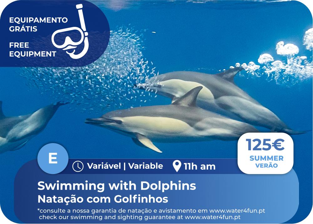 Nesta atividade de snorkeling com golfinhos selvagens poderá ter um contacto mais direto e natural com estes magnificos animais. Sendo possivel ouvi-los a comunicar entre si e observa-los debaixo de água.